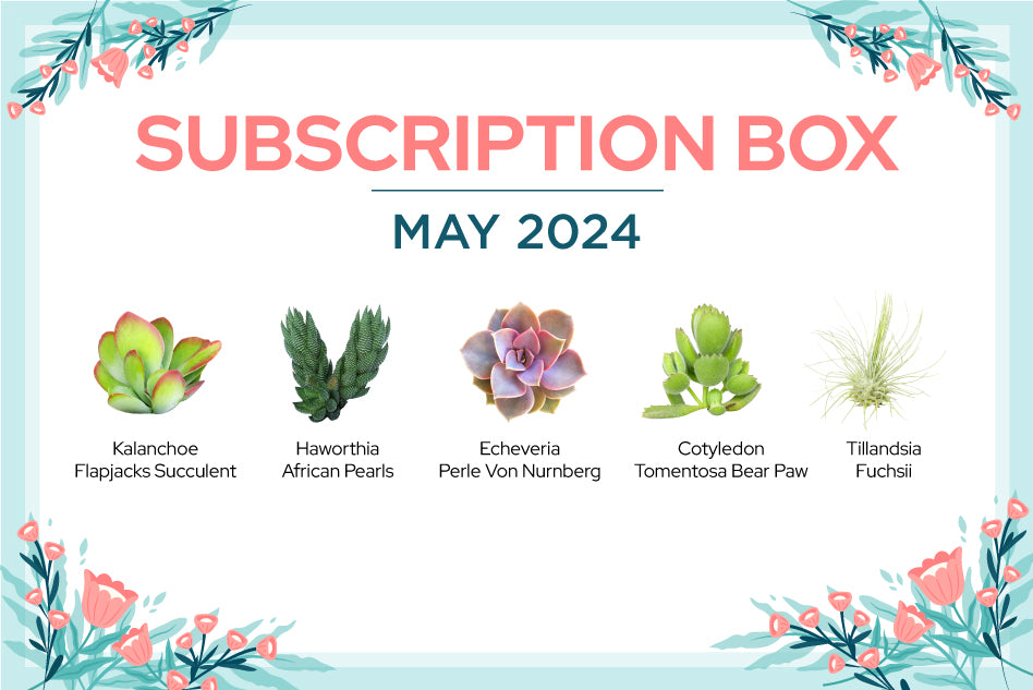 Get ready to succulent-ize your May! 🌱 This month's box is packed with green goodness: Kalanchoe Flapjacks Succulent, Haworthia African Pearls, Echeveria Perle Von Nurnberg, Cotyledon Tomentosa Bear Paw, and Tillandsia Fuchsii.
