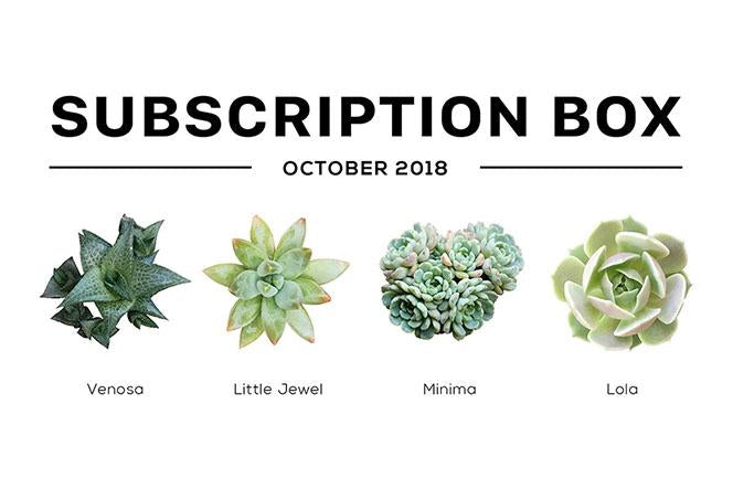 Fall has come and with them comes our October subscription box. This month please welcome to your collection: Haworthia Venosa, Pachyveria Little Jewel, Echeveria Lola and Echeveria Minima.
