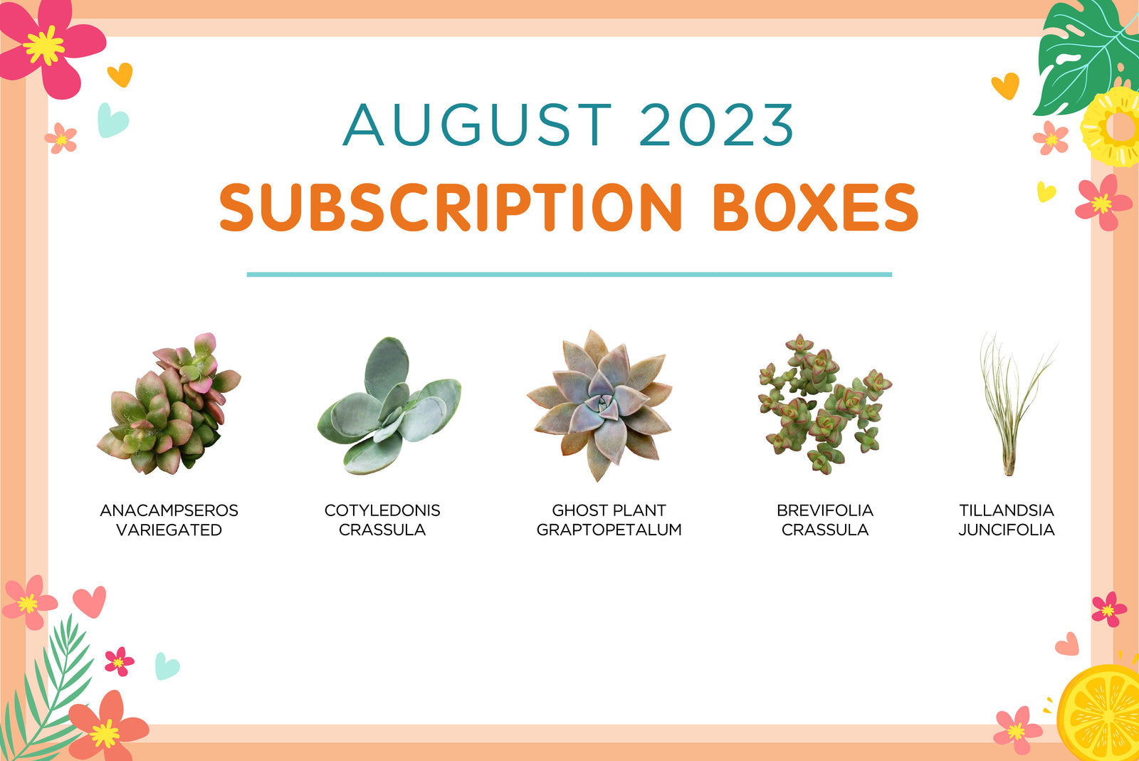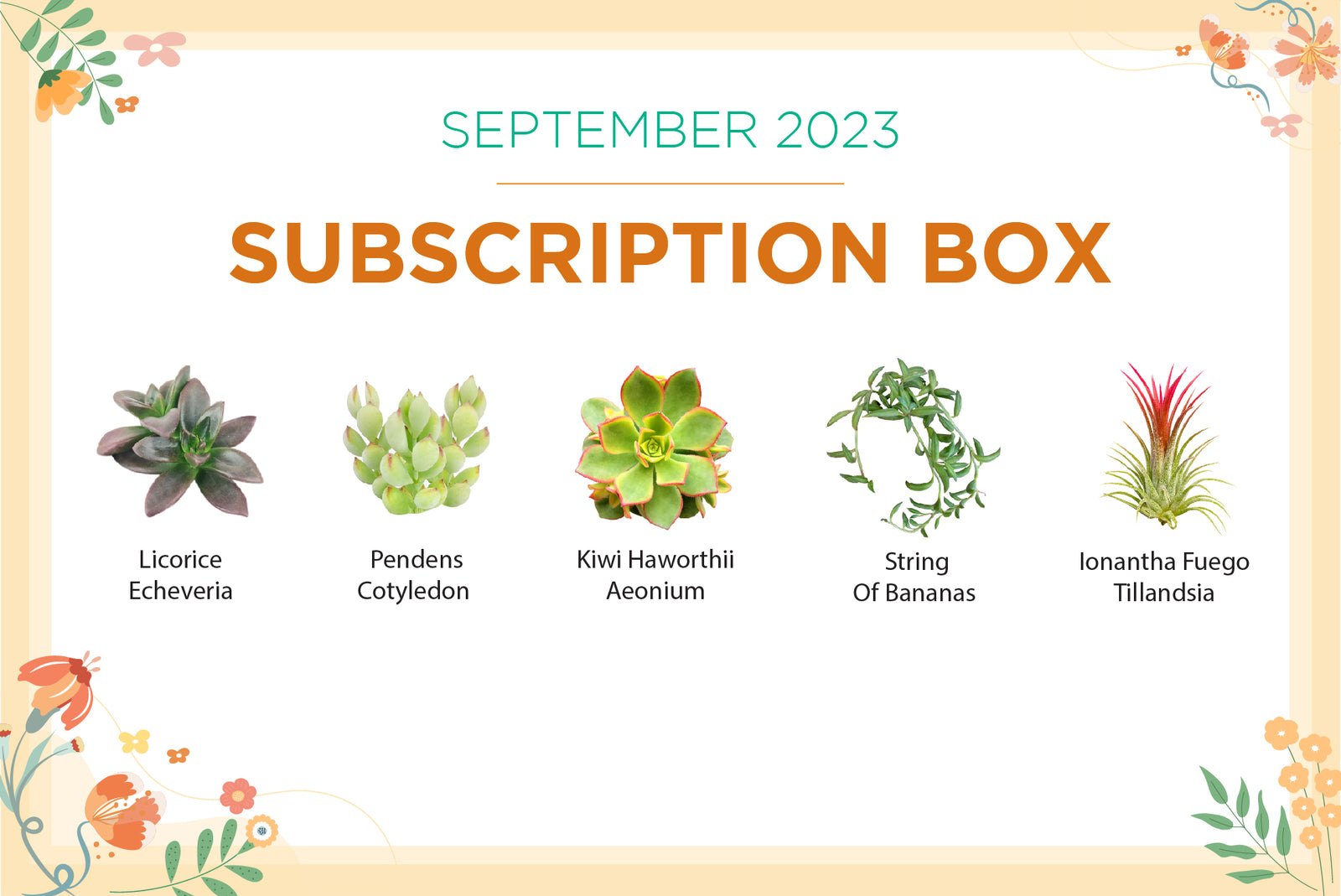 Get ready for a Succulent September! Our Subscription Box is filled with these stunning beauties: Echeveria Licorice, Cotyledon Pendens, Aeonium Kiwi, String of Bananas, and Tillandsia Ionantha Fuego.