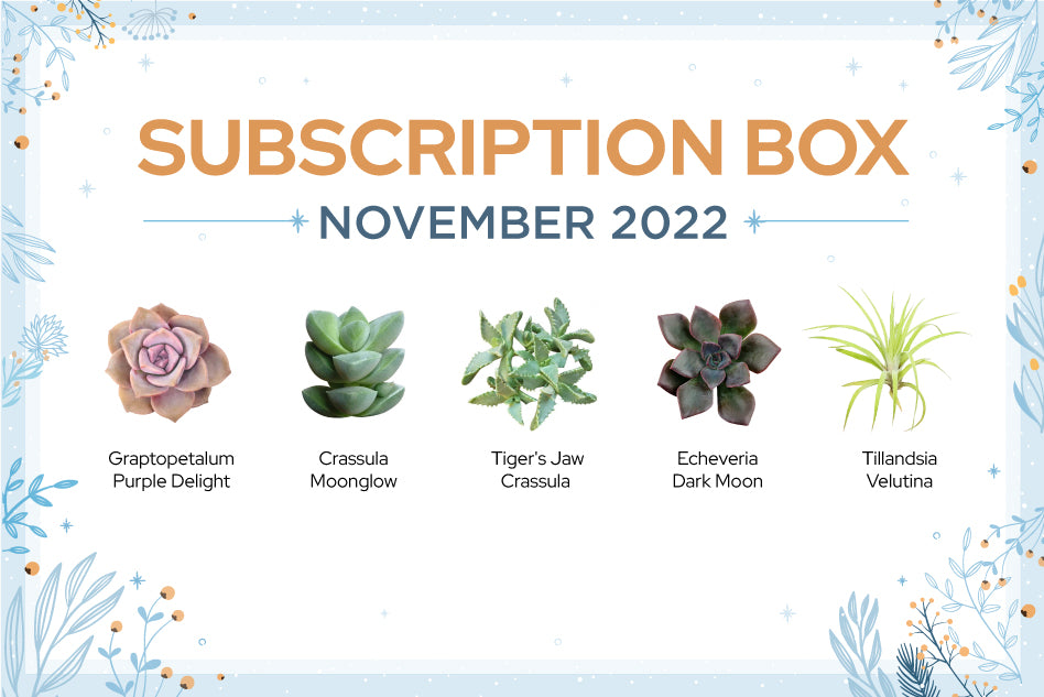 Welcoming November by our Succulents Subscription Box with these beauties: Graptopetalum Purple Delight, Crassula Moonglow Succulent, Tiger's Jaw Crassula, Echeveria Dark Moon, and Tillandsia Velutina. Let's figure out more about them and their care instruction with us!