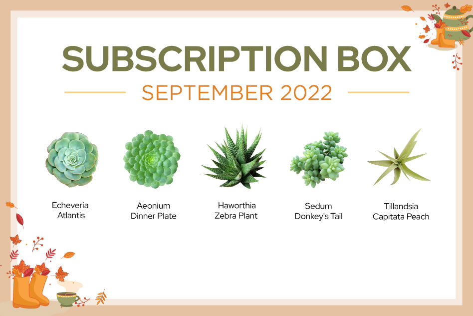 September has come and with them our Succulents Box for this month! Please welcome to your collection: Aeonium Dinner Plate, Zebra Haworthia, Donkey's Tail Succulent and Echeveria Atlantis.