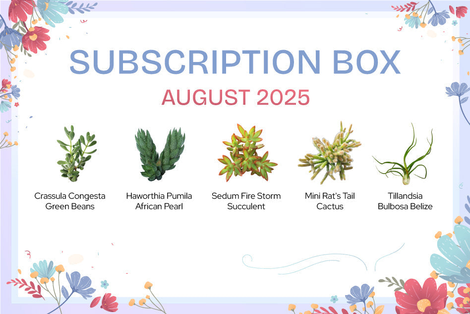 Welcome to your August 2025 Succulent Box — packed with five unique plants: Crassula Congesta ‘Green Beans,’ Haworthia Pumila ‘African Pearl,’ Sedum ‘Fire Storm,’ Mini Rat’s Tail Cactus, and Tillandsia Bulbosa Belize. In this care guide, you’ll learn how to meet each plant’s specific needs—from light, soil, and watering routines to propagation tips—so they flourish in your space. Whether you’re a beginner or a seasoned succulent lover, you’ll find clear instructions to keep every plant in this month’s box healthy, vibrant, and growing strong.