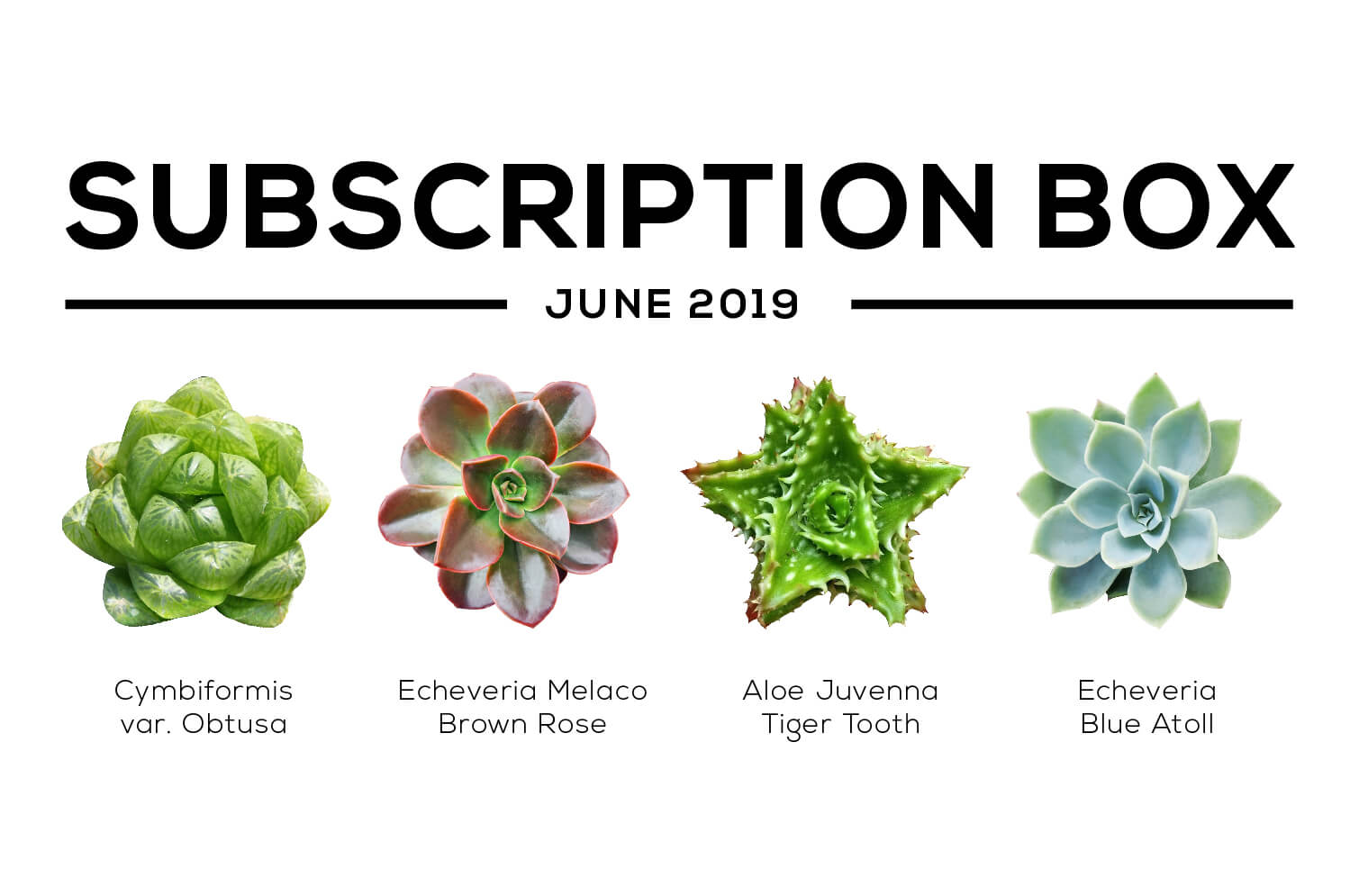 It's summer time and here's our cutie box for June featuring: Haworthia cymbiformis var. obtusa, Echeveria Melaco, Aloe Juvenna Tiger Tooth, Echeveria Blue Atoll.