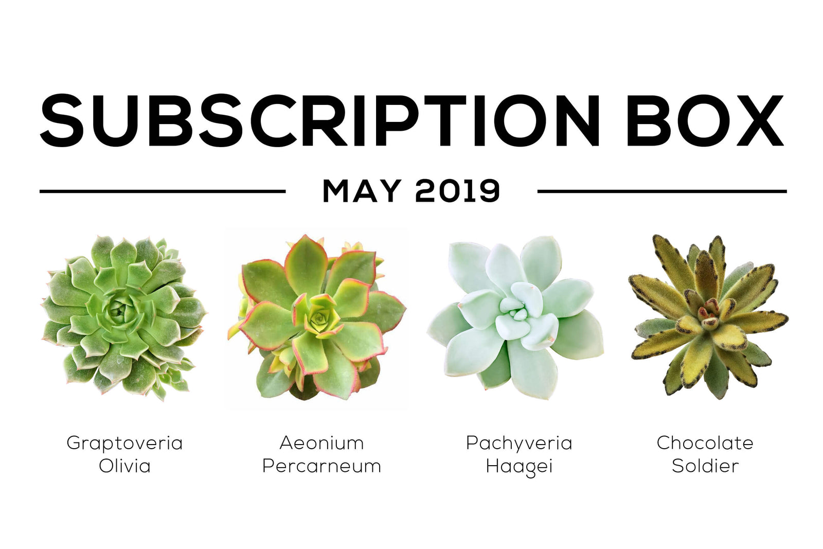 May is here with our beautiful box featuring: Graptoveria Olivia, Aeonium Kiwi, Chocolate Soldier and Pachyveria Haagei.