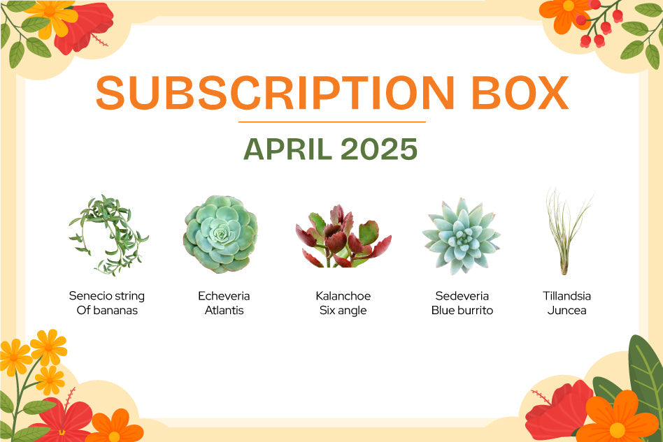 Our April subscription box is here! This month's collection includes Senecio String of Bananas, Six Angled Kalanchoe, Sedum Donkey's Tail, and Echeveria Atlantis. A perfect mix for succulent lovers to grow and enjoy!