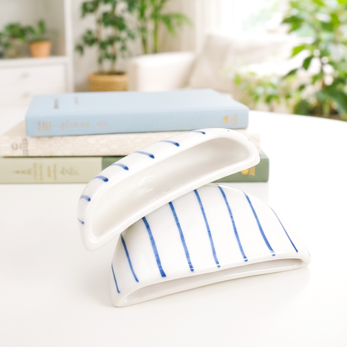 Hand-painted royal blue stripes add a bold, decorative touch, making these planters as much wall art as they are plant holders. Perfect for creating a modern, space-saving display in any room.