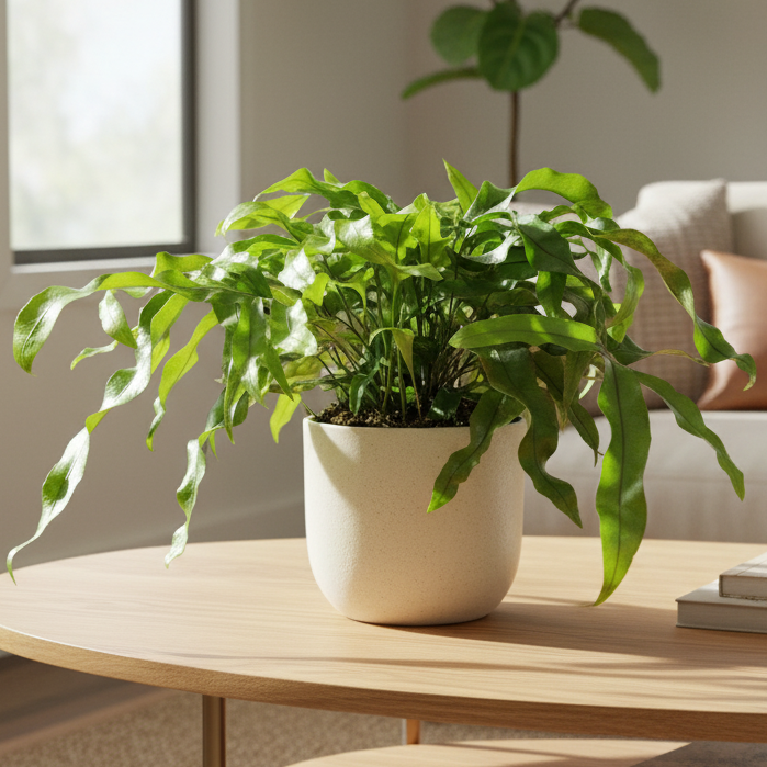 Unlike the delicate, feathery foliage of many traditional ferns, Kangaroo Paw Fern features thick, slightly waxy frondswith a deep green, glossy finish—often showing a faint bronze or bluish tint under certain lighting. The fronds have a sculptural, deeply lobed and asymmetrical shape, setting them apart visually from softer-textured ferns like Boston or Maidenhair. This bolder texture also makes the plant more tolerant of drier air and less frequent watering than its more sensitive relatives.