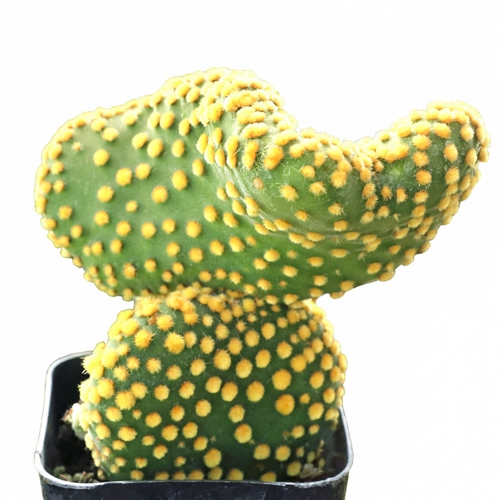 The Opuntia microdasys f. monstrosa, or "Crazy Bunny Ears," is a whimsical and rare mutation of the popular Bunny Ears Cactus.Unlike the symmetrical, round pads of the standard species, the "monstrosa" form grows in a distorted, wavy, and sculptural way. Each pad is unique—twisting and clumping into a "crazy" formation that looks like a cluster of tiny, distorted rabbit ears covered in fuzzy white dots.