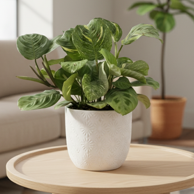 Bright, indirect light is best. More light is required than non-variegated Marantas to maintain the vibrant white/yellow patterns. Crucially, avoid direct sunlight, which will scorch the delicate leaves and cause the colors to fade.