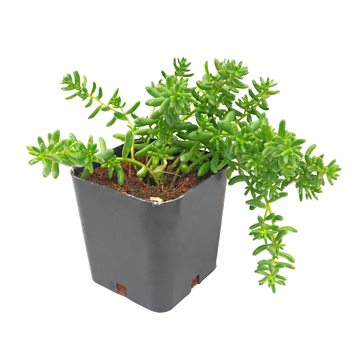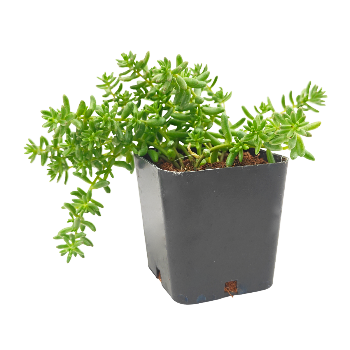 Sedum album ‘Coral Carpet’ forms dense, low mats of tiny bead-like leaves that create a soft ground cover. The foliage is bright green at first but can turn shades of coral red when exposed to full sun, drought, or cool temperatures. The small, rounded leaves pack tightly together, giving the plant a neat, carpet-like appearance. This variety spreads steadily as it grows and is well suited for ground cover, green roofs, or rock gardens. In midsummer, it may produce clusters of small white, star-shaped flowers. It grows best outdoors in full sun with well-draining soil and is very drought tolerant once established. Propagation is easy by trimming a section of stem and replanting it to root.